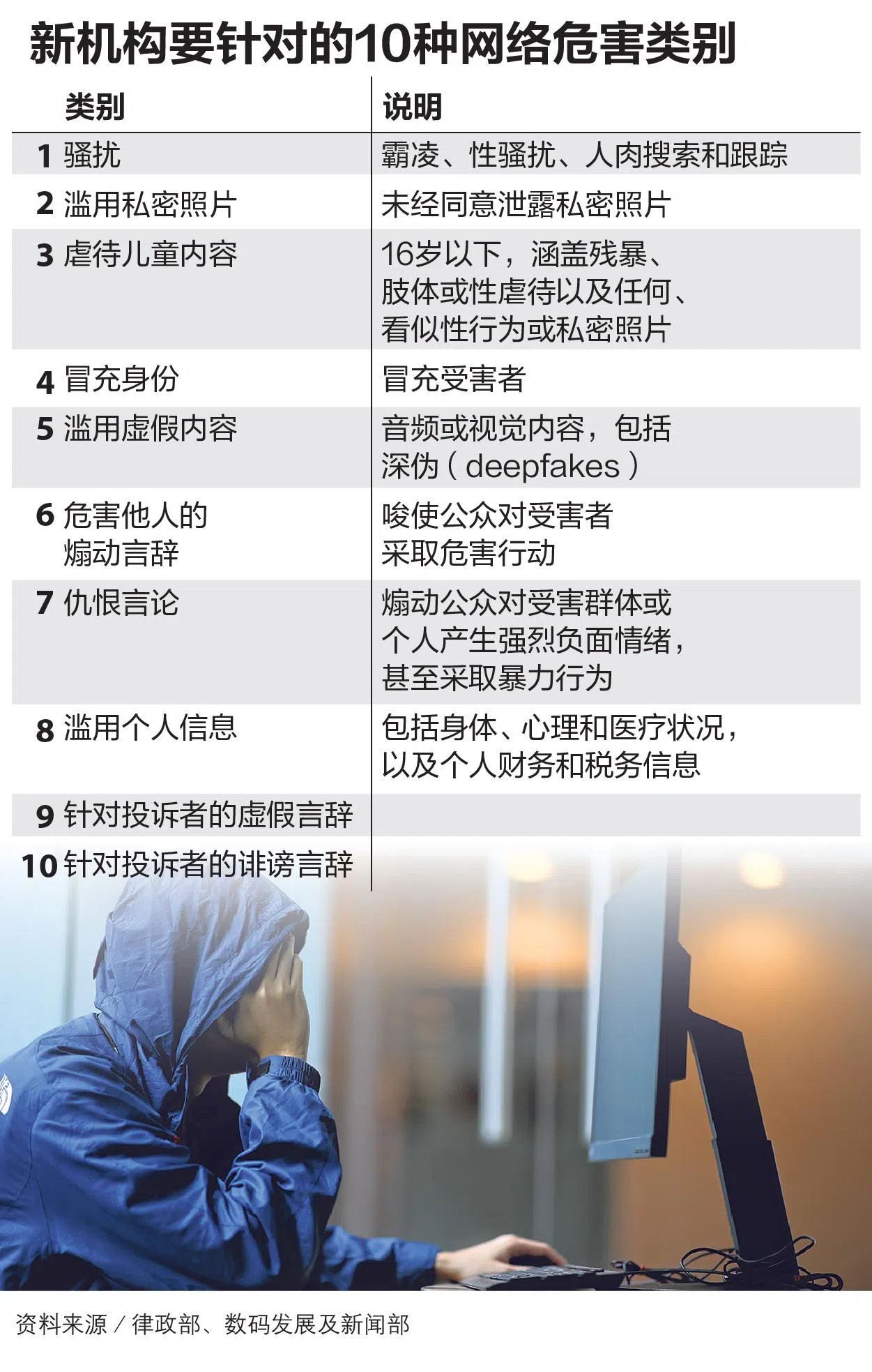 政府会成立新的监管机构来处理网络受害者的投诉,到时我国将是全球首几个设有专门网安机构的国家。澳大利亚也有负责调查网络霸凌及传播他人私密照和非法内容的专属部门。