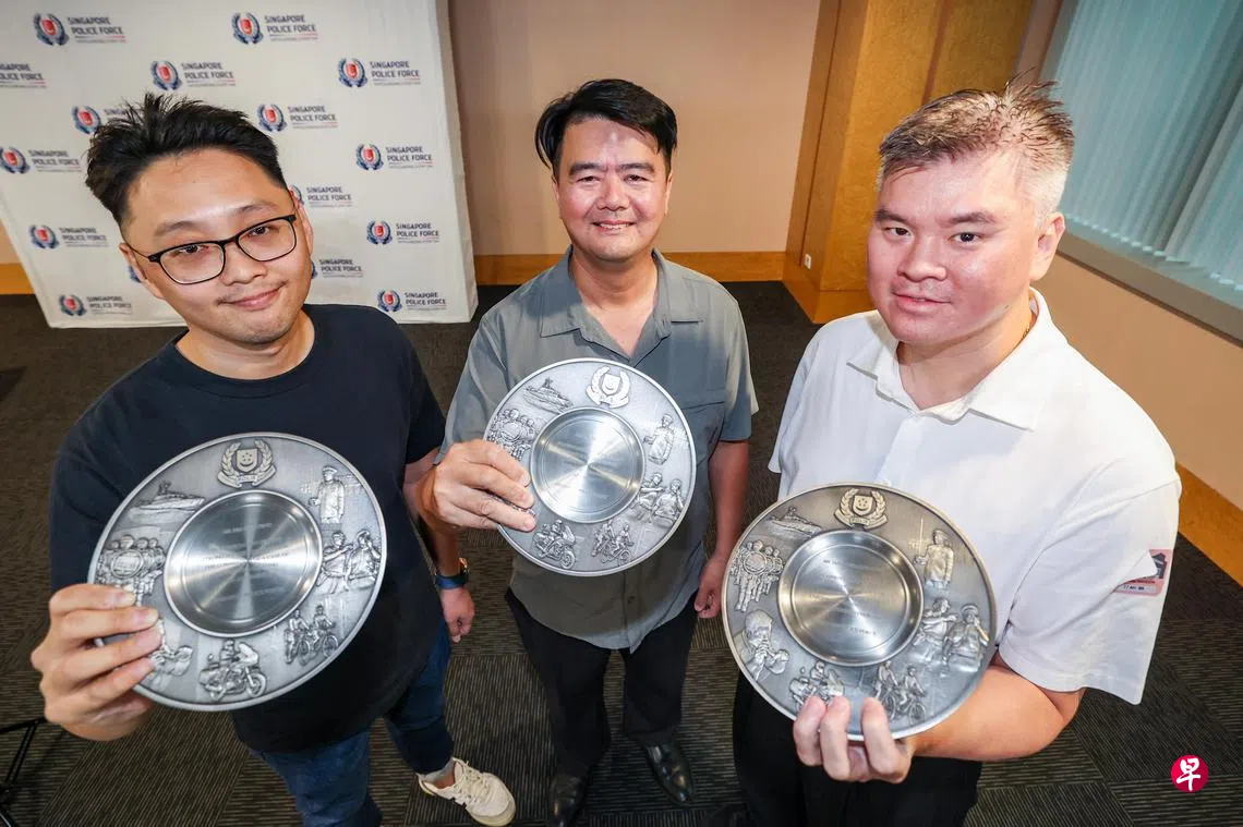 梁世钢和另外六名来自阁室、Best Denki、T2 Electronics的职员,星期五(11月22日)获新加坡警察部队颁发社区合作奖,感谢他们协助调查。