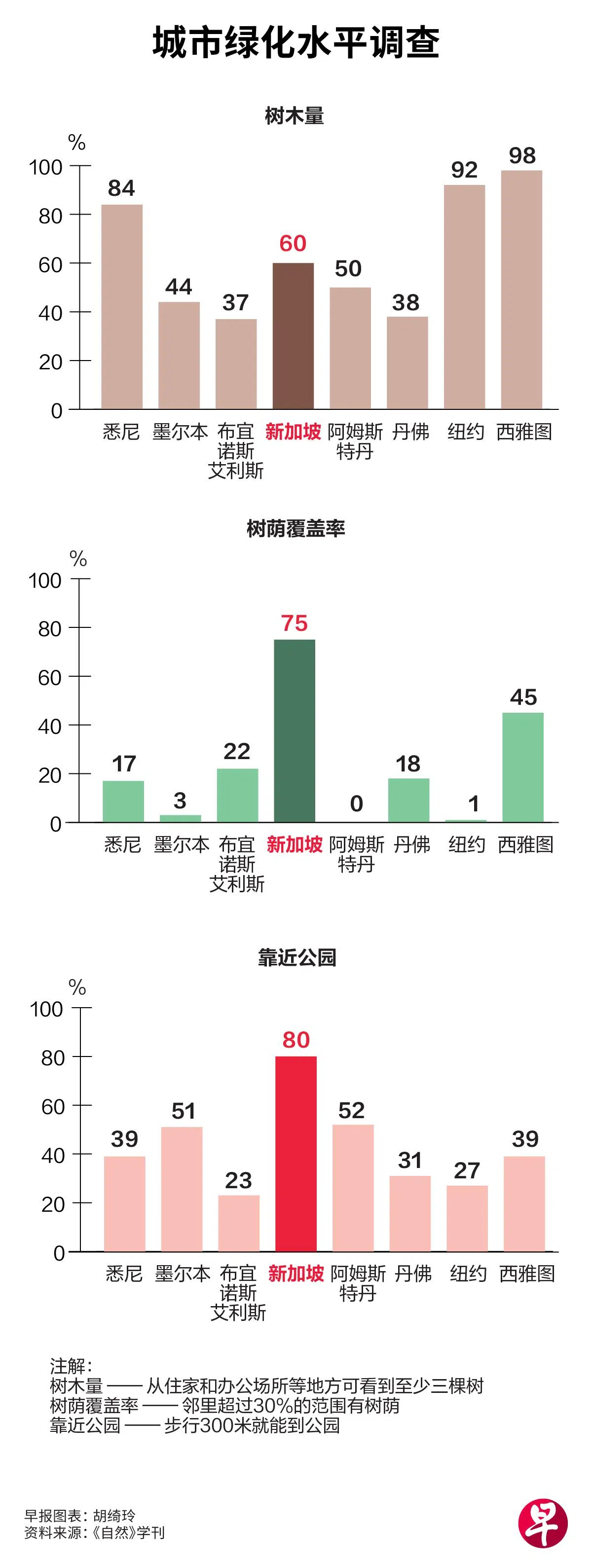 这项调查由澳大利亚皇家墨尔本理工大学和慕尼黑理工大学学者进行,调查结果11月刊登在《自然》学刊。研究团队利用“3-30-300”标准来评估各城市的绿化水平,当中有三个指标,分别是人们从住家和办公场所等建筑能看到至少三棵树;邻里超过30%的范围有树荫;以及人们步行300米就能到公园。