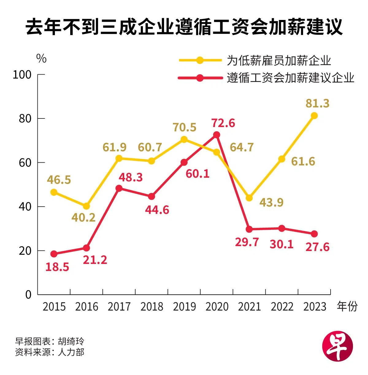 人力部在今年3月至6月,向逾4900家聘有至少10名员工的企业调查后发现,只有不到三成或27.6%的雇主依照工资会的加薪建议,调整员工薪水。