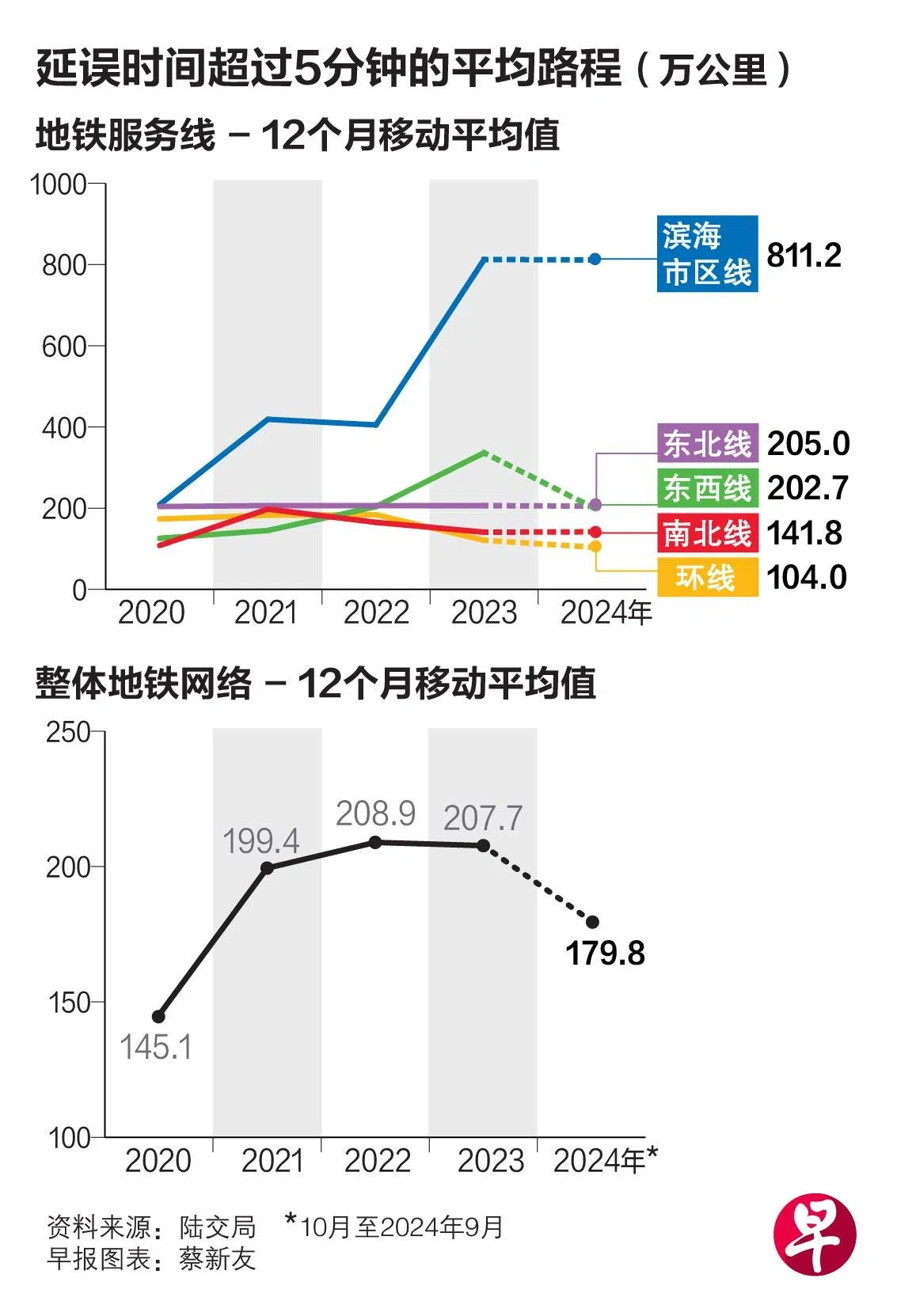 陆路交通管理局日前在网站上公布最新的地铁服务可靠度数据。整体来看,2023年,地铁每行驶207万7000公里,就发生一起超过五分钟的延误事故。但从去年10月至今年9月的12个月移动平均来看,地铁每行驶179万8000公里,就有一起超过五分钟的延误。
