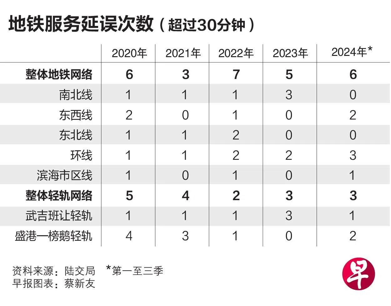 我国地铁网络今年第一至第三季,共发生六起超过30分钟的延误,超越去年的五起。轻轨网络今年第一至第三季,则发生三起超过30分钟的延误事故,与去年持平。