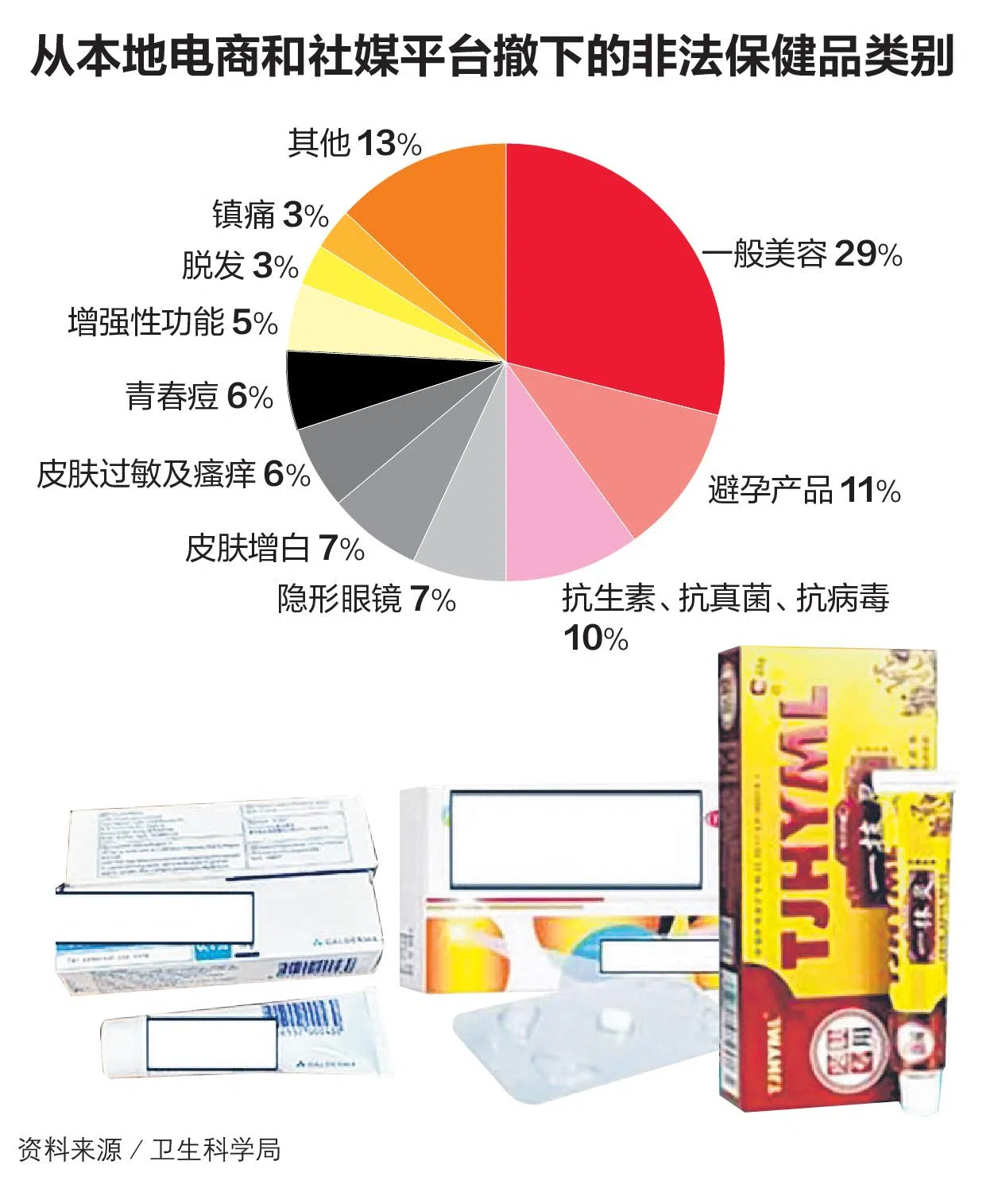 期间,卫科局撤下3336个非法保健品列表。其中,美容类产品占48%,当中包括美白及治疗青春痘和湿疹等产品。其余产品涉及避孕、抗生素、抗真菌、抗病毒、皮肤过敏、隐形眼镜和防脱发等10多个类别。处方药和只限药房销售的药物,则约占40%。