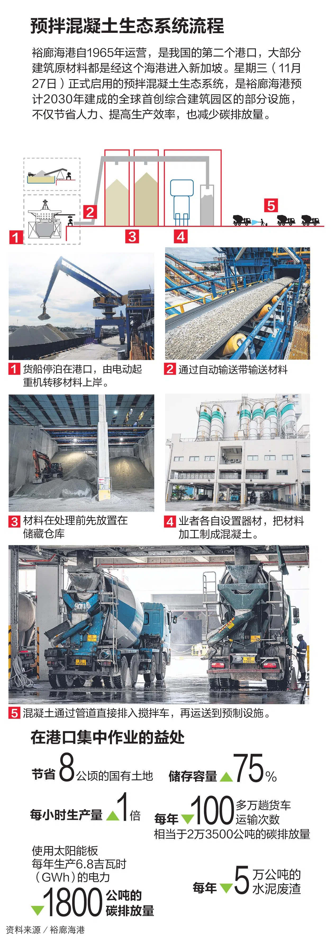 全球首创,斥资2亿元建造的预拌混凝土生态系统在裕廊海港正式启用,生产力将倍增,并每年减少2万5000多公吨的碳排放量,相当于约1万2750个四房式组屋单位一年的用电量。