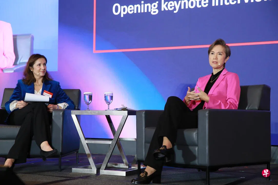 杨莉明星期四(11月28日)出席亚洲人工智能创新研讨会,在开幕仪式上接受Economist Impact编辑主任布思(Tamzin Booth)的专题访问。研讨会由Economist Impact举办,这家公司是经济学人集团旗下的品牌,从事媒体与咨询业务。