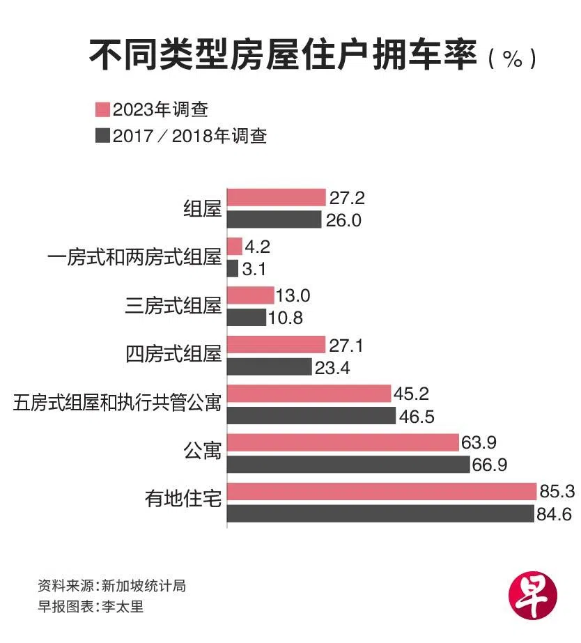 若以拥车家庭所居住的房屋类型来看,过去五年,住在公寓和五房式组屋及执行共管公寓的家庭,拥车率有所下降。拥车率增长最明显的是住在一房和二房式组屋的家庭,拥车率为4.2%,高于10年前调查的2.4%。