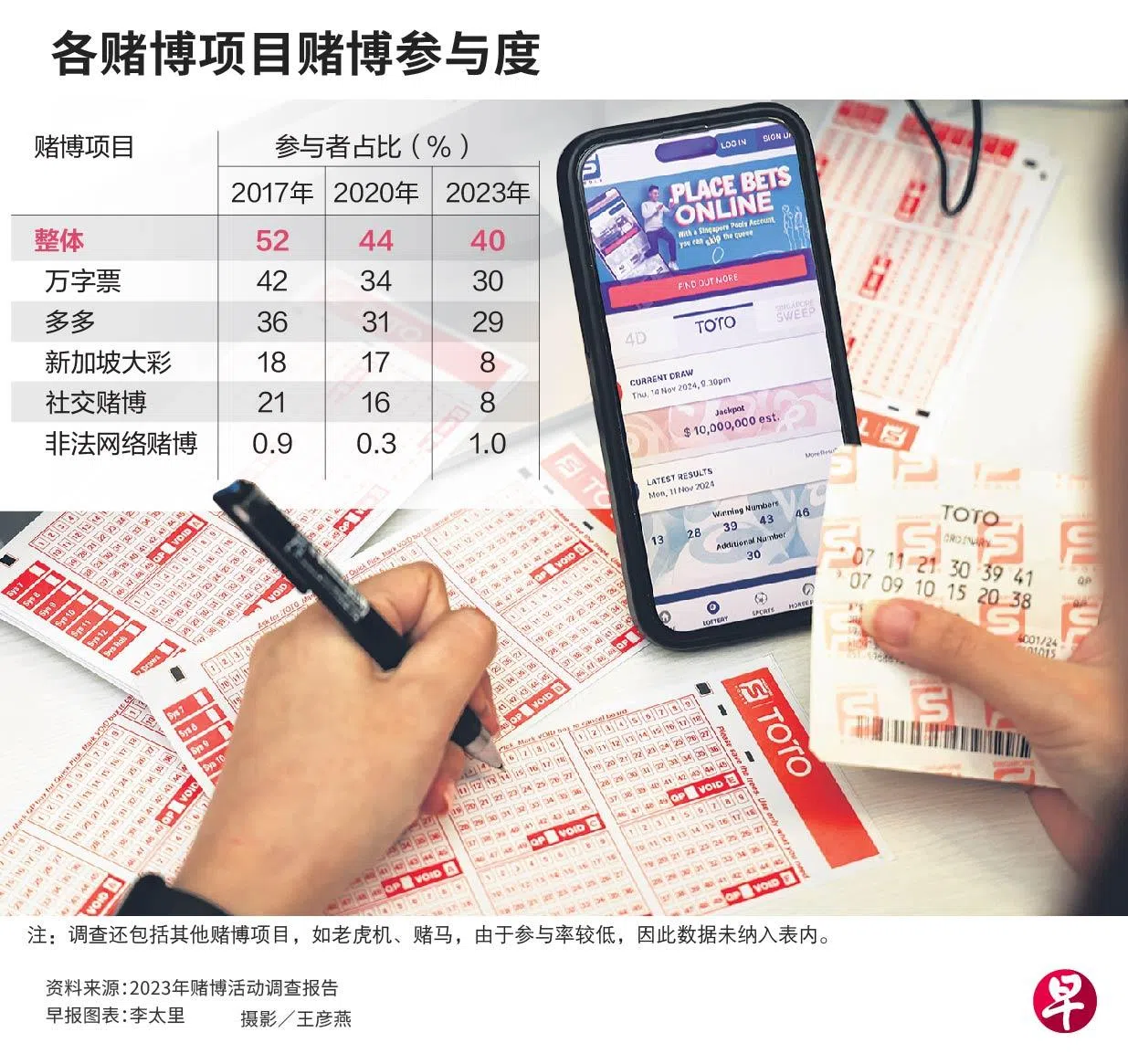 新加坡居民的赌博和赌博成瘾情况受控。过去一年,有四成受访者曾赌博,写下新低,显示相关的社会保障措施奏效。非法网络赌博则小幅上升。