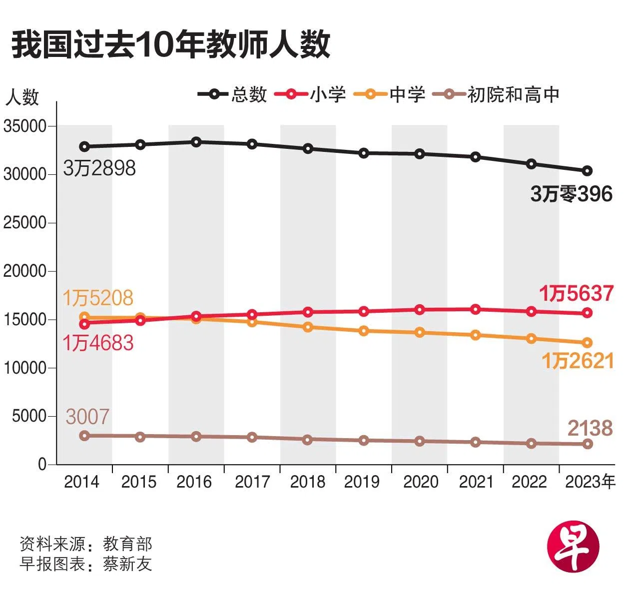根据教育部今年11月公开的常年报告数据,我国中小学、初级学院和高中教师总数自2016年后逐年减少,从3万3000多人减至2021年的3万1834人,这个人数到了2022年和2023年分别降至3万1111人,和3万零396人。教育部还未公开2024年的教师人数。