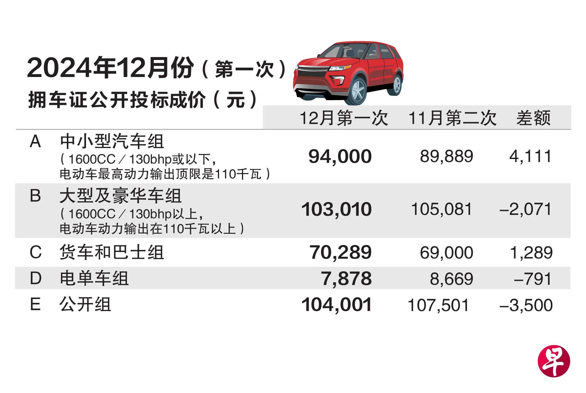 12月第一轮拥车证公开投标活动星期三(12月4日)结束,应对大众市场需求的中小型汽车组(A组)成价上升4111元(4.57%),报9万4000元。
