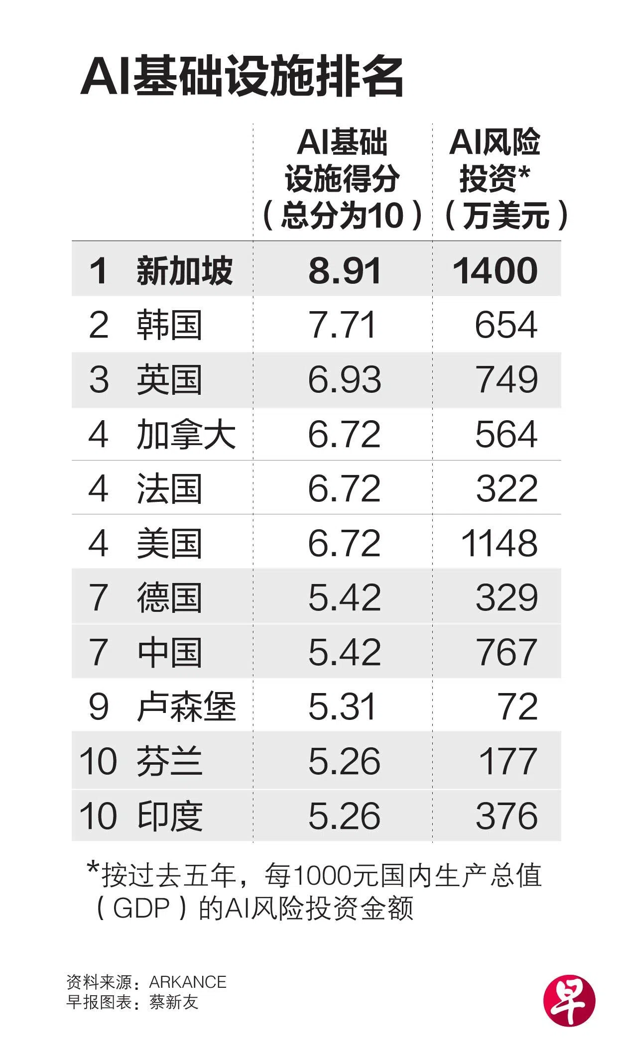 根据提供数码化解决方案的法国集团MONNOYEUR子公司ARKANCE星期三(12月4日)发布的一项调查报告,新加坡在AI基础设施方面的评分位居全球第一,得分为8.91,高于韩国的7.71和英国的6.93。