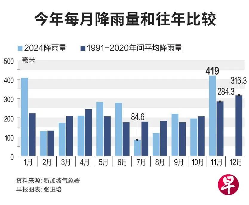 新加坡气象署数据显示,今年11月本地总降雨量为419毫米,较同月的历史平均降雨量284.3毫米高出约47%,也是1980年以来的最高值。第二高的11月总降雨量在1992年录得,为390.1毫米。