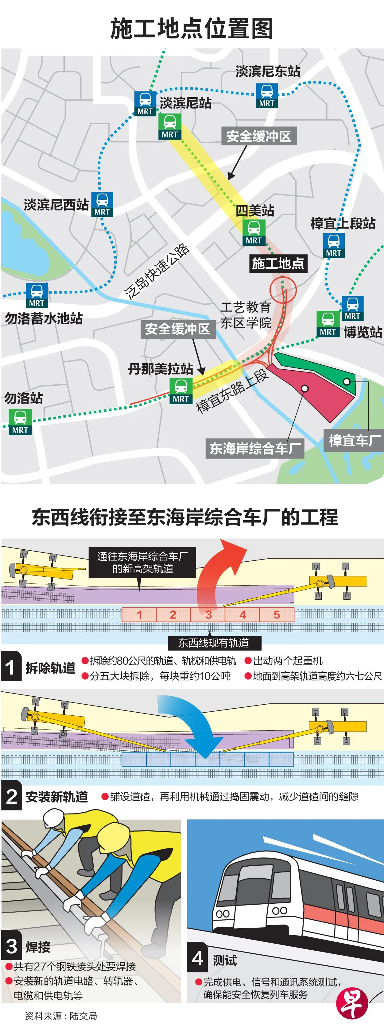 由于东西线日后将改用东海岸综合车厂,须拆除重接部分轨道。在施工期间,四美站关闭,从丹那美拉站至淡滨尼站也没有列车通行,列车服务原定星期三(11日)恢复。