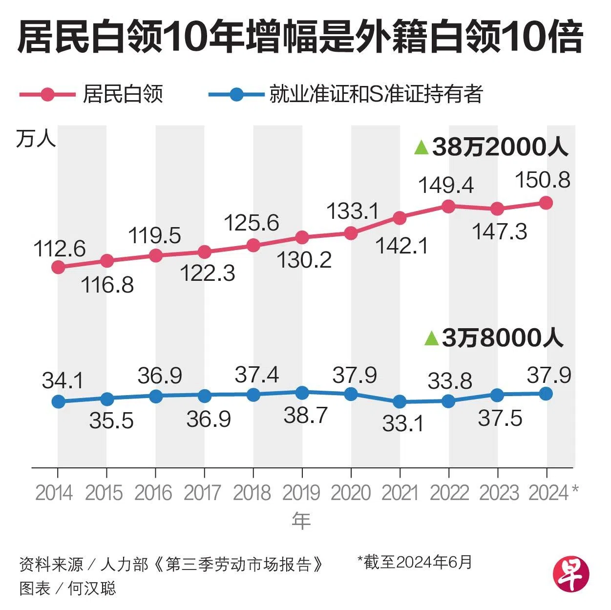 过去10年,本地白领雇员人数的增幅,是外籍白领的10倍。人力部指出,这意味着每新增一个就业准证或S准证持有者,就相当于为本地人增加10个白领工作岗位。