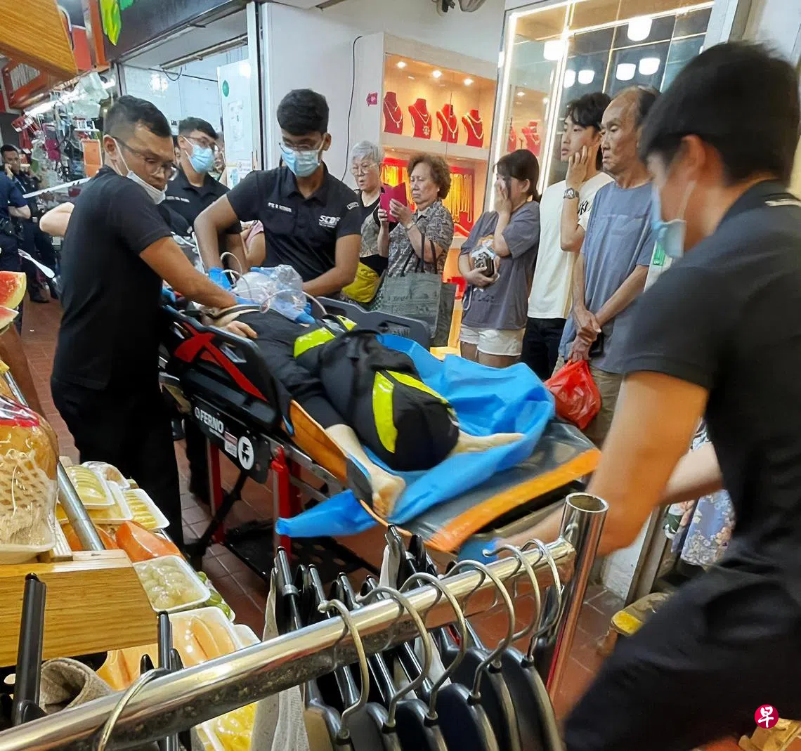 《联合早报》记者在约中午12时45分抵达事发地点。警方已拉起重重封锁线,将事发的五金店,以及相邻的水果店、金铺和诊所围起。警员在场戒备,男嫌凶在下午1时15分由救护车送走。