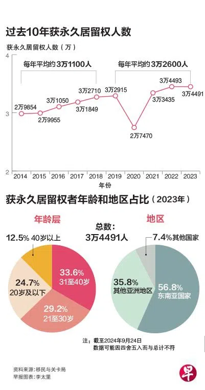 《2024年人口简报》也显示,我国的非居民人口在2023年增加了5%,其中主要是工作准证持有者,永久居民则增加了1.2%。