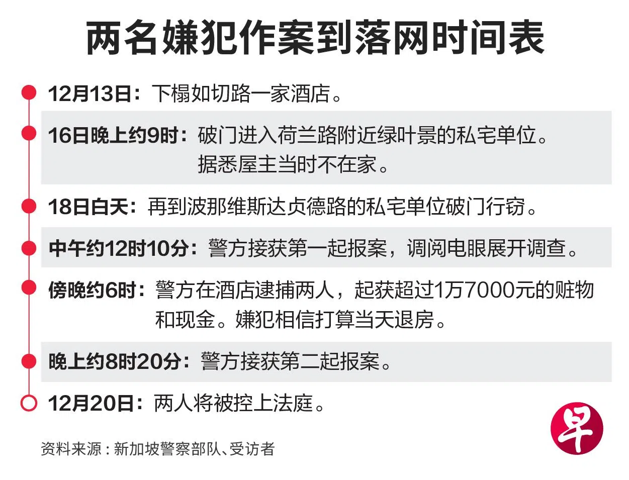 警方说,绿叶景私宅单位是在星期一(16日)晚上约9时遭破门行窃,当时住户并不在家。警方在星期三(18日)中午约12时10分才接获报案,查案人员随即调阅单位内部和周围的电眼画面,经过后续调查,快速锁定两名男嫌犯的身份。