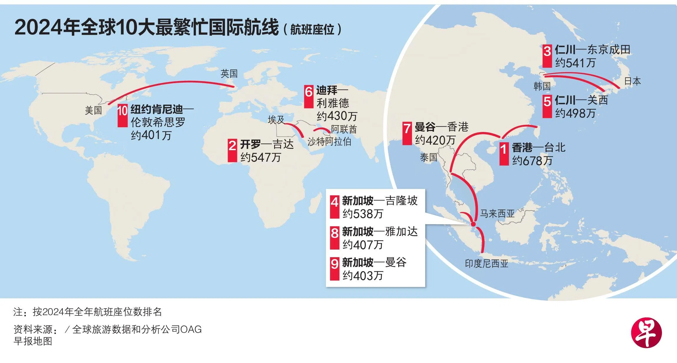 2024年全球最繁忙的十大国际航线当中,亚太航线占了七个。除了上述所提,还有往返首尔(仁川机场)—大阪航线(第五位)和往返曼谷—香港航线(第七位)。