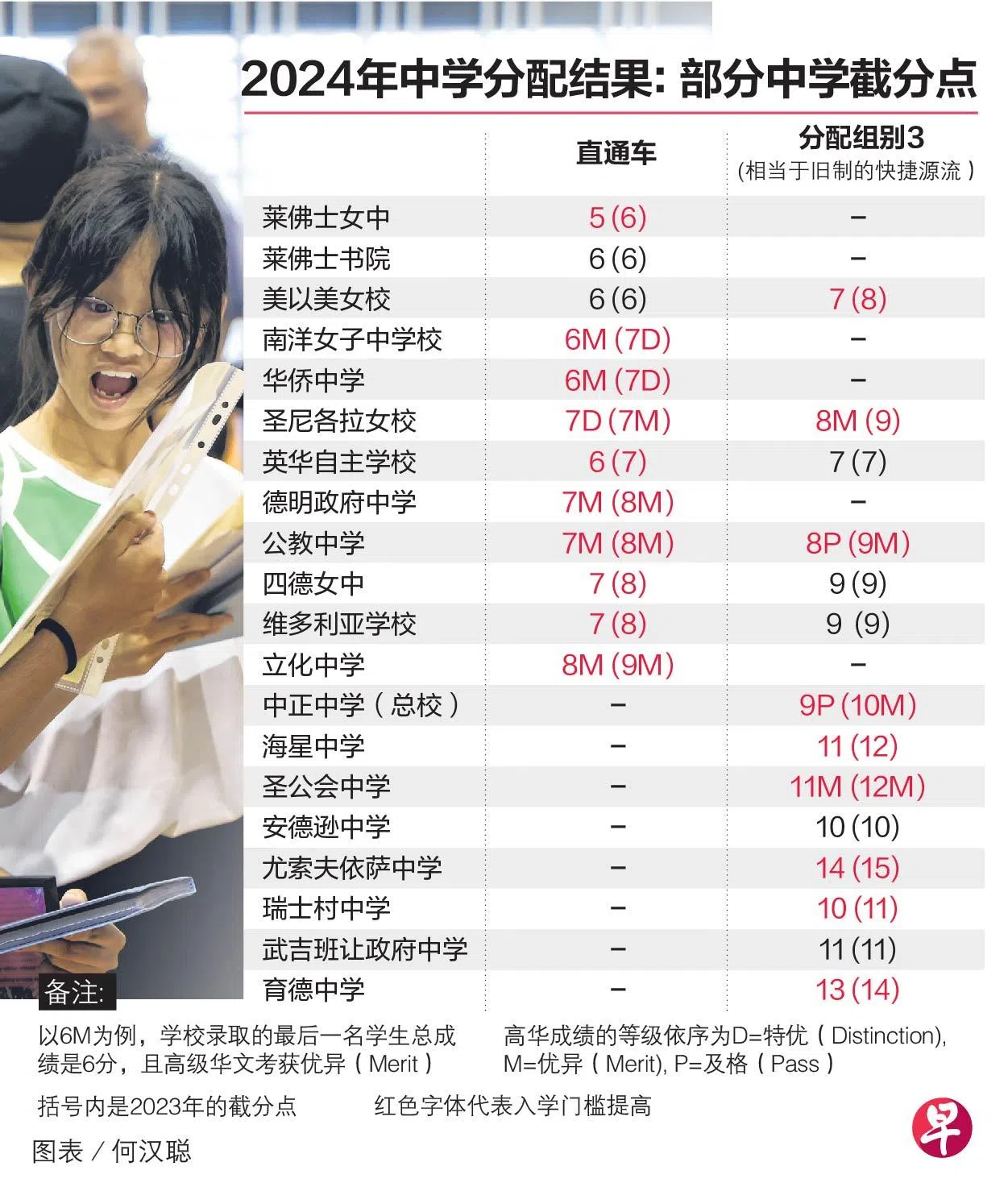 《联合早报》记者查询25所学校的截分点,除了一般被视为热门的学校,也包括几所邻里中学。当中,约四分之三的截分点都比去年低一分,意味入学门槛稍微提高。莱佛士女中的截分点从上一届的6分下调至5分,南洋女子中学校和华侨中学则从7D下调至6M。6M指的是总成绩6分,且高级华文考获优异(Merit,缩写M)。高华成绩按表现水平依序为特优(Distinction,缩写D)、优异和及格(Pass,缩写P)。