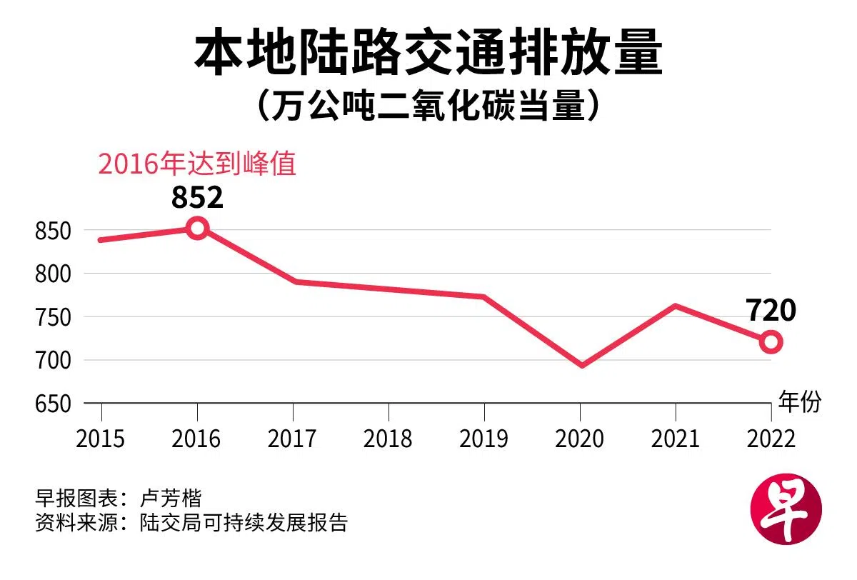陆路交通是我国第三大排放源(仅次于能源和工业领域),排放量在2016年达到峰值,即852万公吨二氧化碳当量(carbon dioxide equivalent)。陆交局的目标是到了2040年,削减超过一半的峰值排放量。