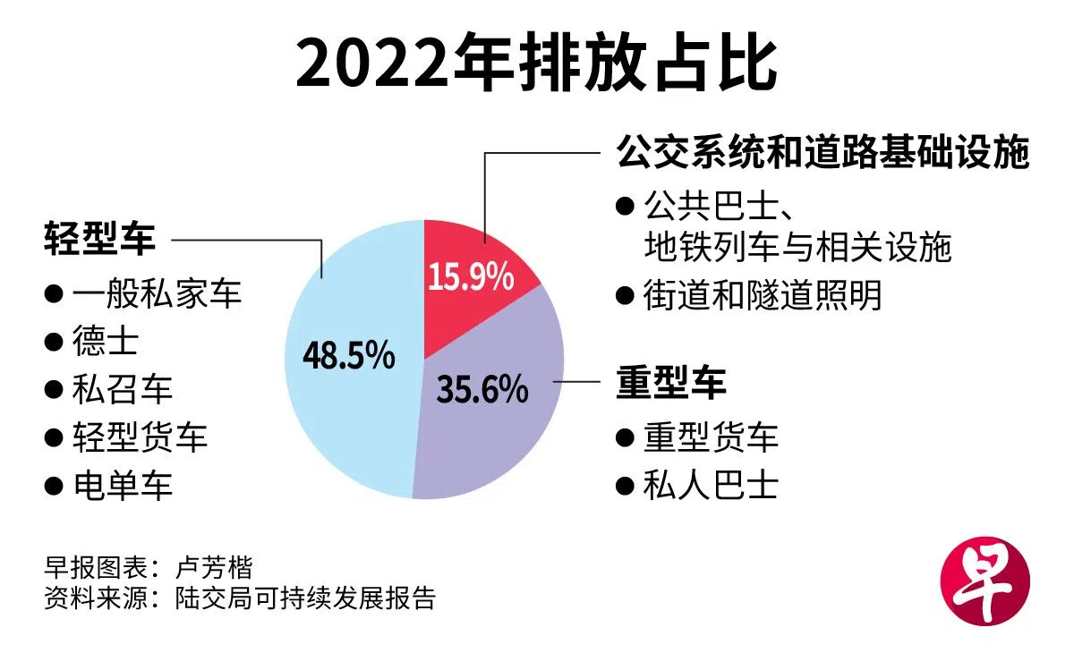 根据报告,2022年的排放量,已下降至720万公吨二氧化碳当量。当中,德士和私召车在内的轻型车占48.5%、重型车占35.6%,公交系统和道路基础设施则占15.9%。