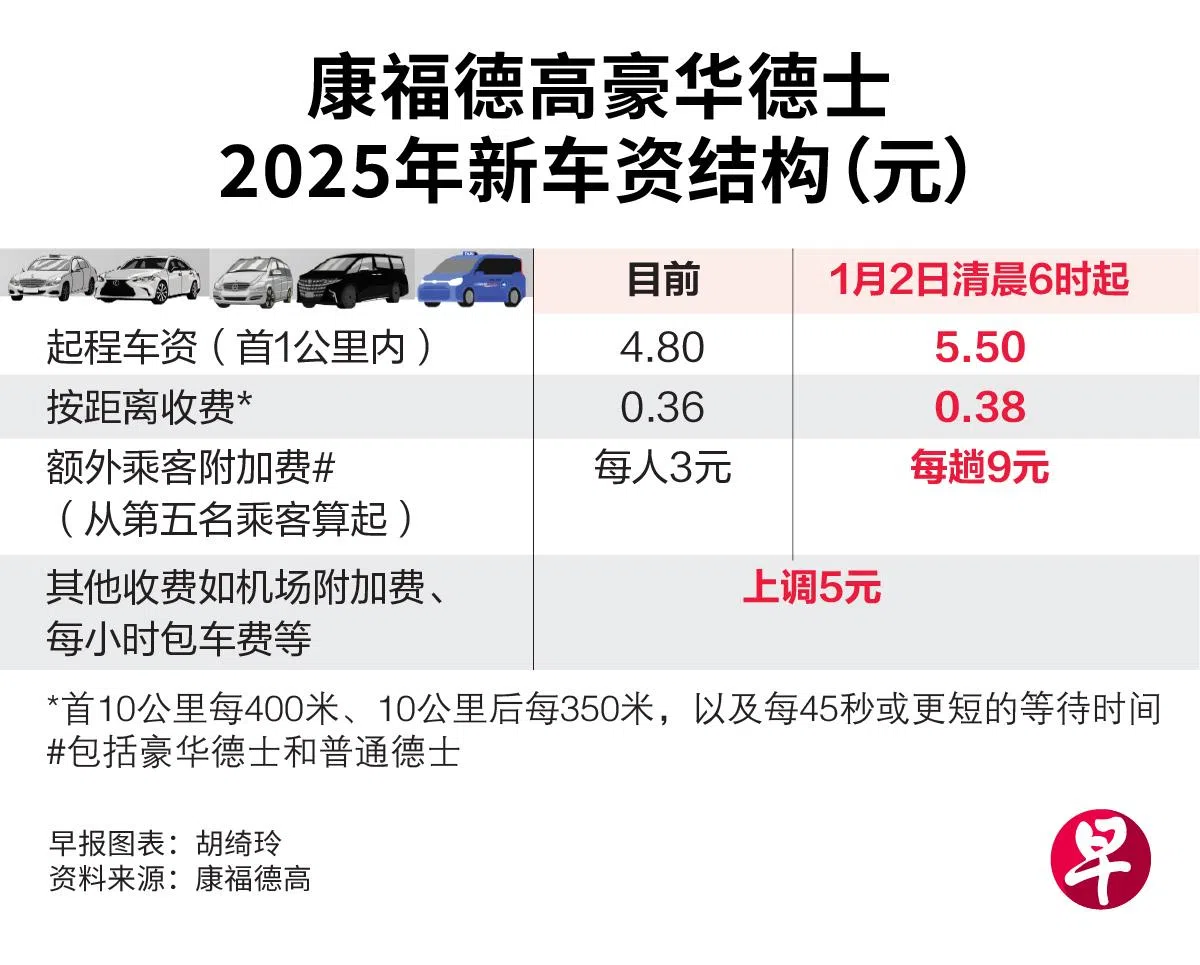 明年1月2日起,康福德高旗下豪华德士车费全面调高,包括起程车资、车程距离收费、等候费及其他服务费。