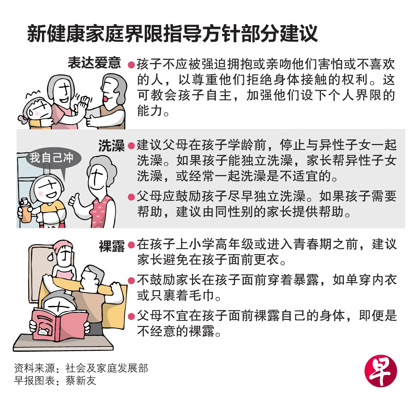 小孩有权利在感到不舒服时拒绝亲亲抱抱、家长应该在孩子多大时停止一起冲凉?当局制定一套有关家长与孩子维持健康界限的指导方针,有些人误以为这是给家长遵从的最新条规,它其实是提供与高危家庭打交道的专业人士参照的。