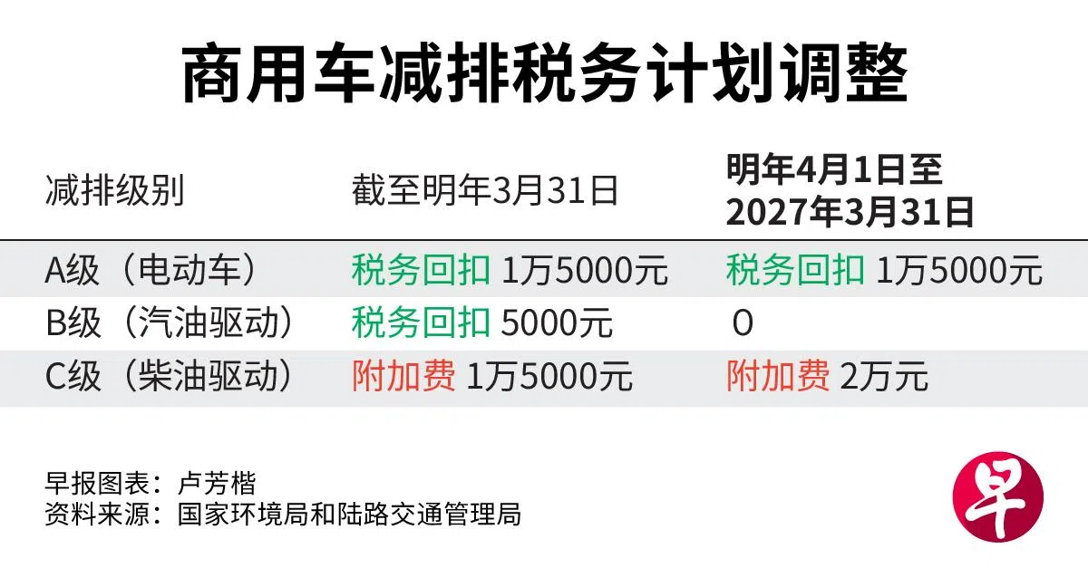 国家环境局和陆路交通管理局星期一(12月30日)发联合文告宣布,为鼓励商用车车主选购更洁能车款,原定明年3月31日到期的商用车减排税务计划(Commercial Vehicle Emissions Scheme,简称CVES)将延长到2027年3月31日。不过,2025年4月1日起,奖励措施将收紧。