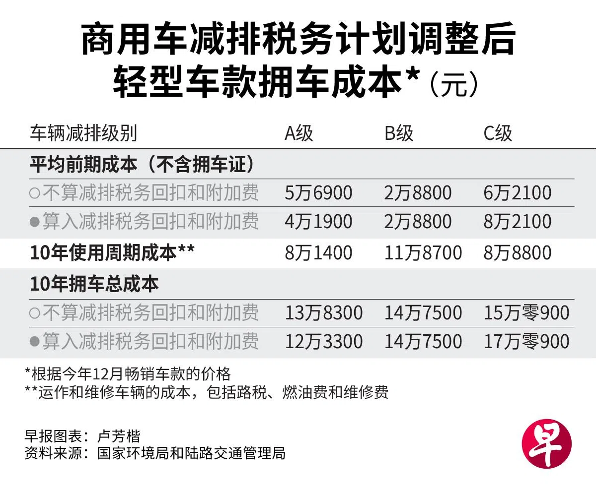 例如,按照新调整计算,一辆A级轻型商用车10年下来的总拥车成本约12万3300元,比B级的14万7500元低了约16%,也比C级的17万零900元低了28%。