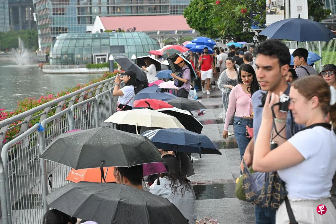 滨海湾一带在元旦前夕下午2时许下了一场15分钟的阵雨,下午3时40分至5时左右又下起大雨,之后也下着淅淅沥沥小雨。