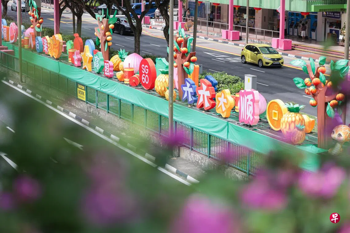 乙巳蛇年喜迎新加坡建国60周年,牛车水新春灯饰特意加入了国花胡姬花,主题灯饰“福树”则象征着国家的繁荣与团结精神。在余东旋街与新桥路之间的三段灯饰中,也加入了SG60标志。