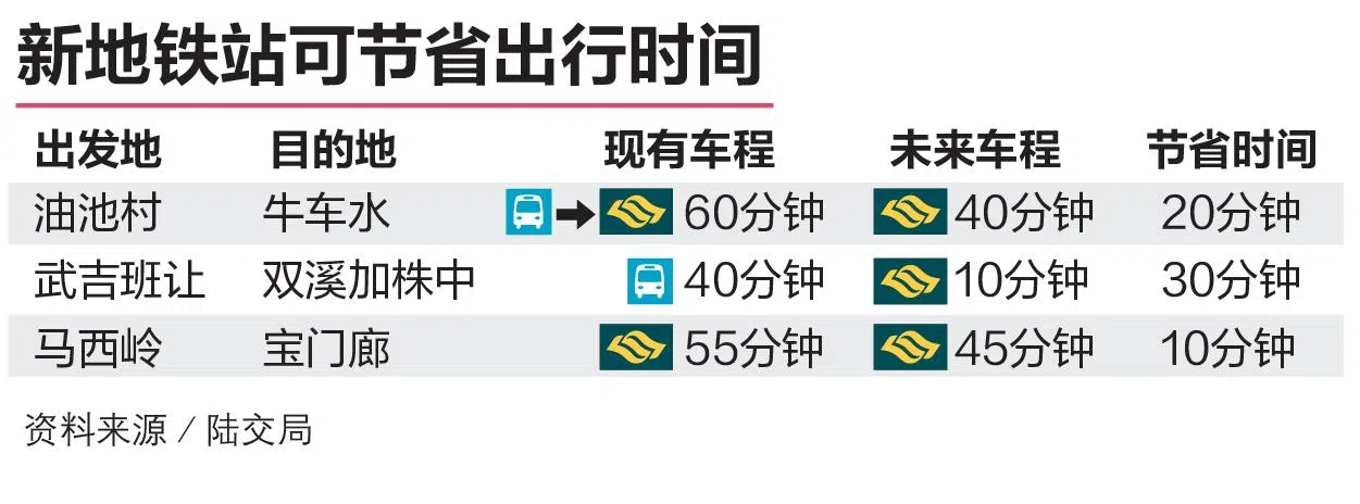 2035年通车后,乘客从油池村(Yew Tee Village)前往牛车水,只要搭40分钟的地铁,相比现在得先坐巴士再换乘地铁,节省20分钟车程。从武吉班让搭地铁到双溪加株中,也只需10分钟,不必再坐40分钟的巴士。