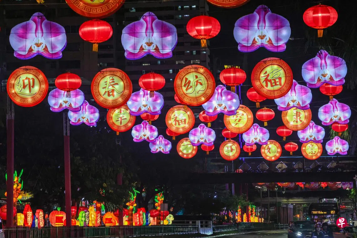 仰望新春灯饰,回望新加坡建国60周年,人们仿佛在这灯火辉映的夜晚中看见了国家发展的轨迹,这不仅是准备迎新,更是为过去的成就感恩,以及期许未来全民持续团结奋斗。配合牛车水亮灯,年货市场也在同天开业,一连举办21天至1月28日大年除夕。