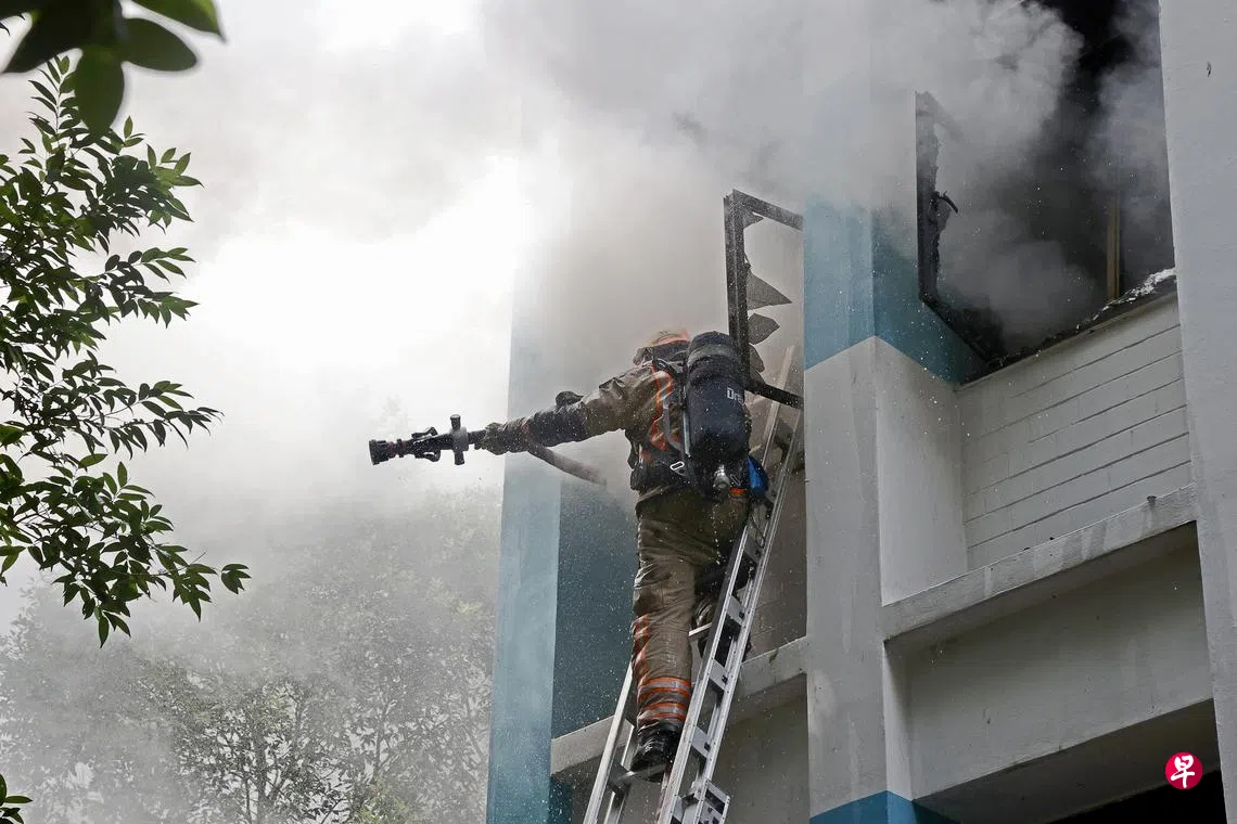 《联合早报》接到读者通报后前往现场,看到民防部队消防员正在现场灭火,警员已在周围拉起封锁线,避免公众进入危险区域。