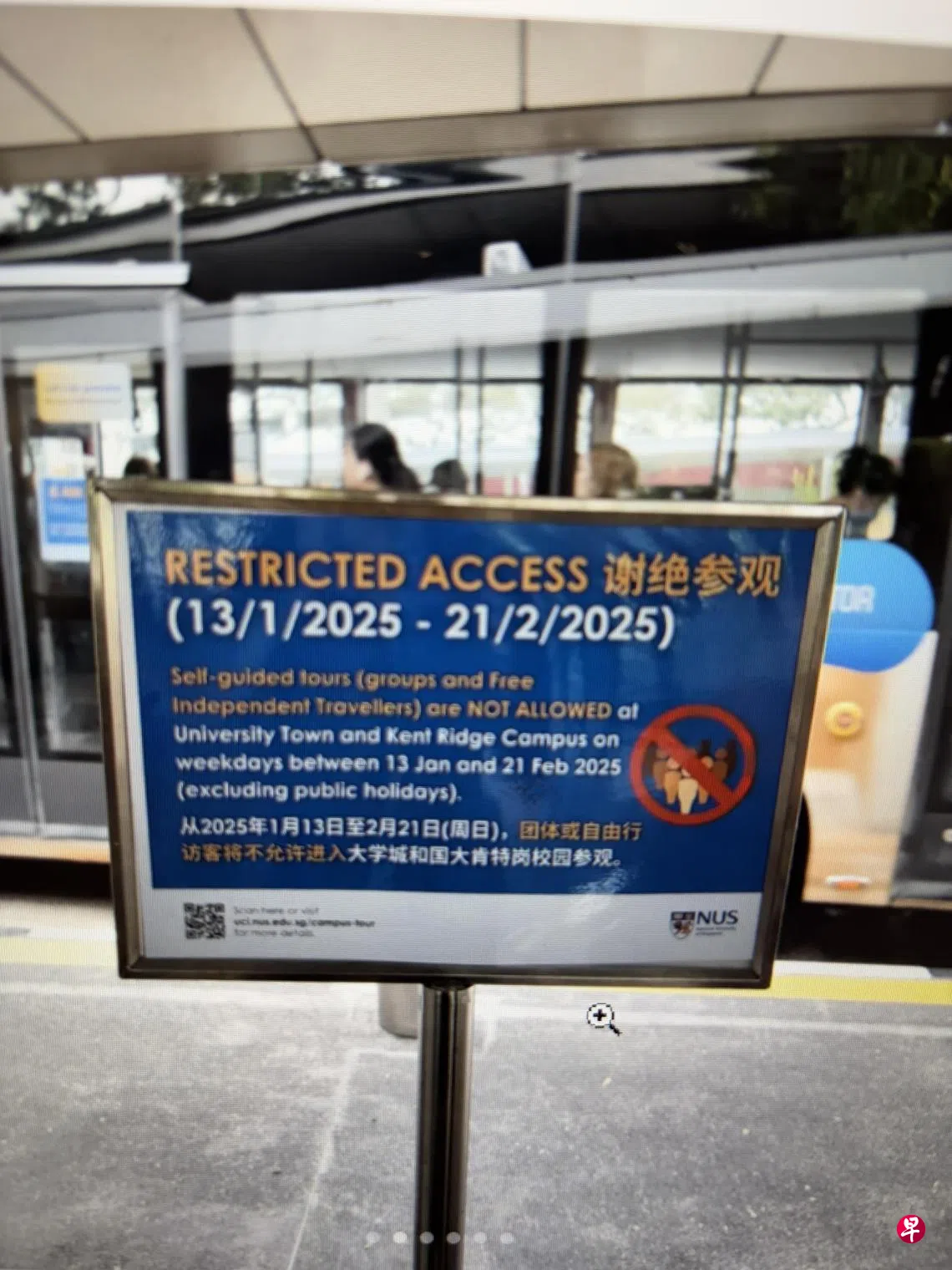 国大去年12月曾发布通告表示,1月13日至2月21日间,到访新加坡国立大学的旅游团都必须预先登记。带团导游可预定学生大使提供的免费导览,或付费雇用与校方注册的学生讲解员,没人陪同的游客会被勒令离开。