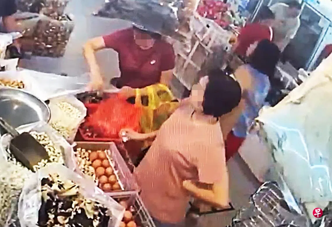 根据摊贩提供的视频,画面显示,女顾客站在摊位旁,似乎是在挑选干粮,右侧突然出现一名穿着红色上衣的妇女,手中拿着几个塑料袋,似乎也要挑选干粮。