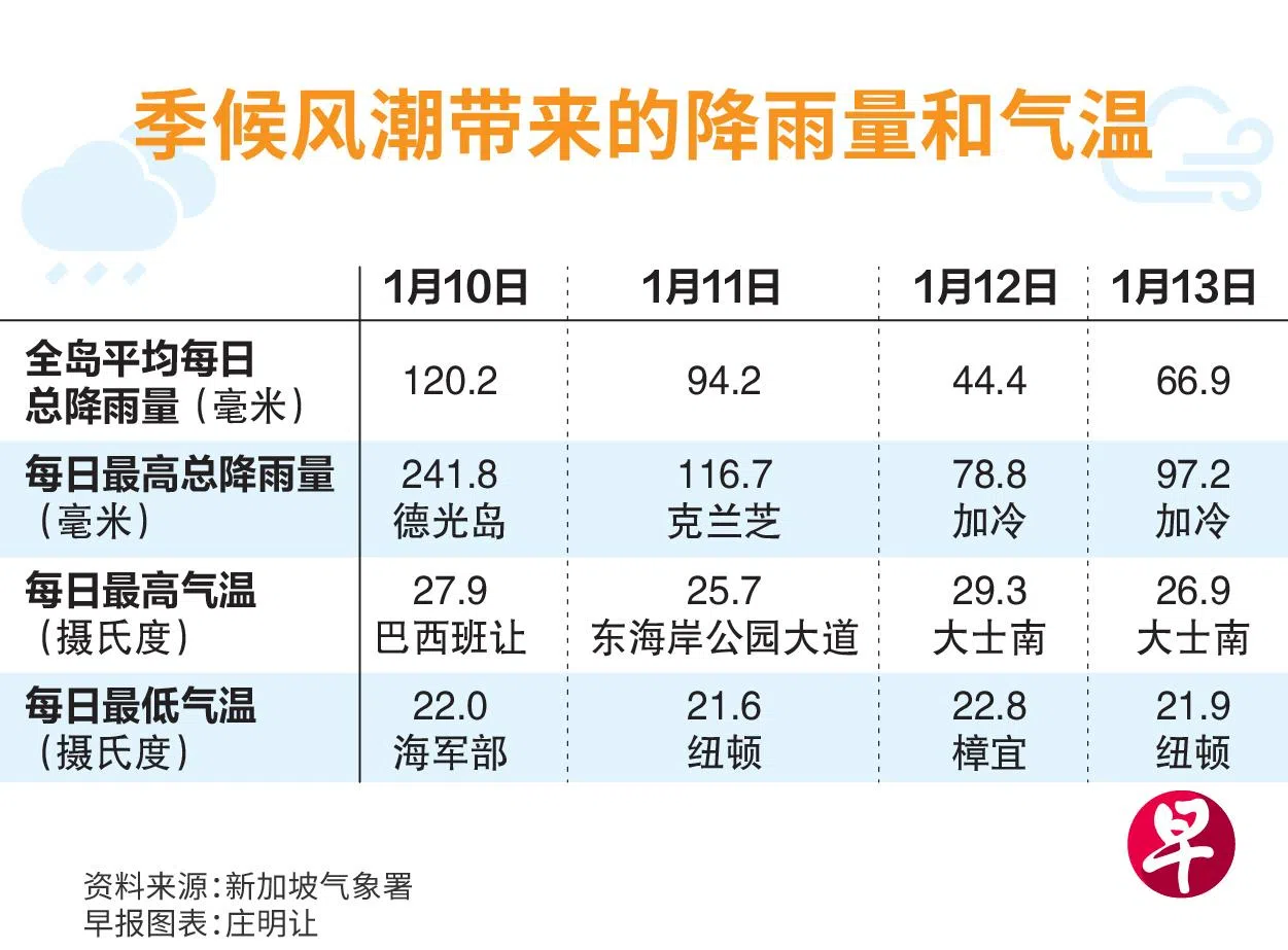 新加坡气象署提供给《联合早报》的数据显示,1月10日至13日,全岛每日平均总降雨量,介于44.4毫米至120.2毫米之间,北部和东部记录的降雨量最高。其中,德光岛星期五录得241.8毫米的最高降雨量,高于2011年1月30日的238.2毫米最高纪录。