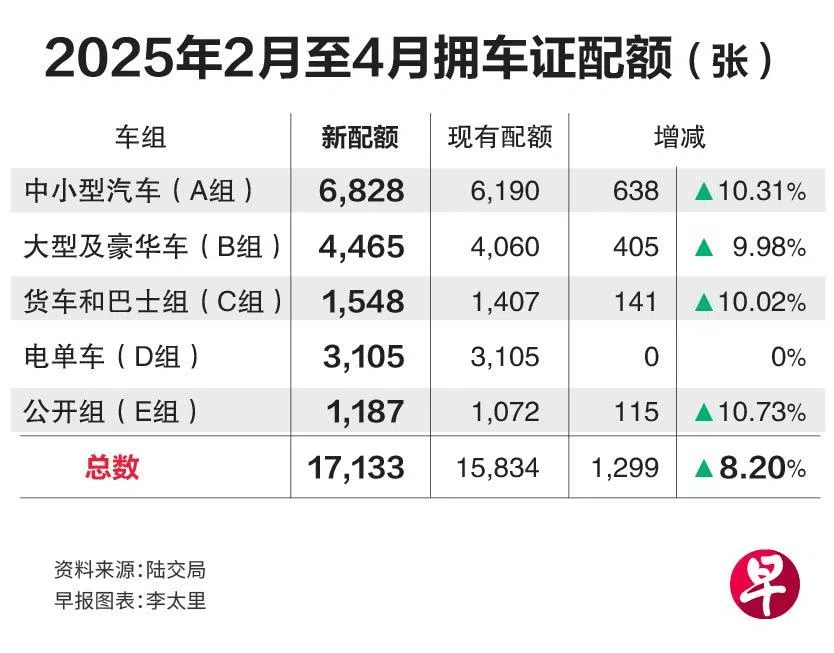 货车和巴士组(C组)配额为1548张,增加141张(10.0%);电单车组(D组)配额保持在3105张。