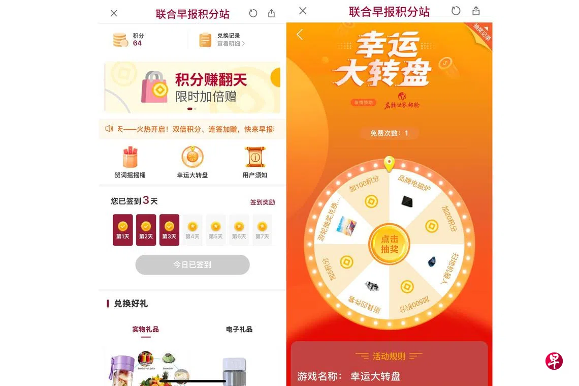 新报业媒体华文媒体集团的旗舰华文报《联合早报》应用自星期三(1月15日)起,推出一项新功能,让读者通过“《联合早报》积分站”完成指定任务积分,并兑换礼品或参与幸运抽奖。