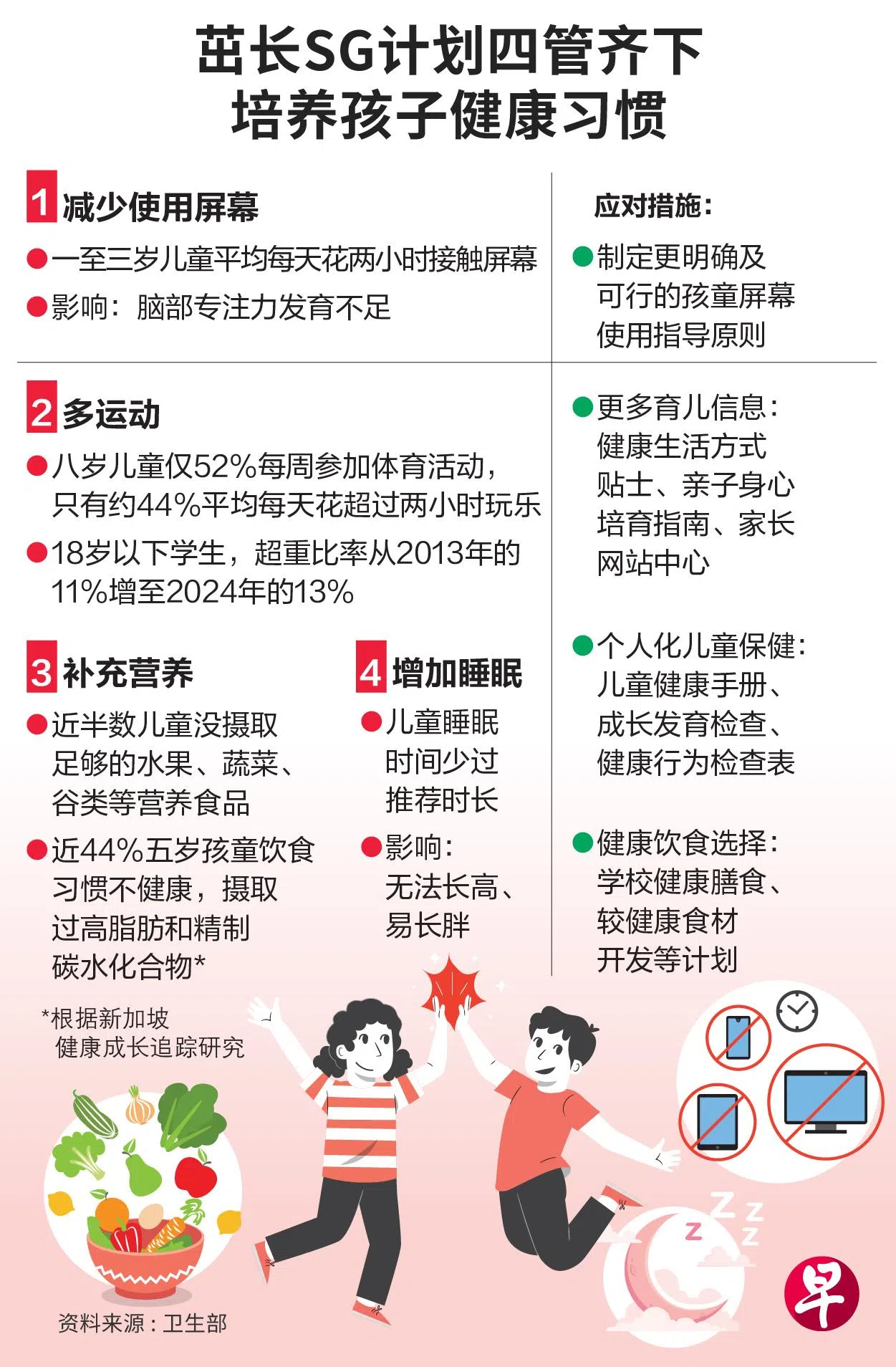卫生部、教育部,以及社会及家庭发展部,星期二(1月21日)携手推出“茁长SG计划”(Grow Well SG),以零岁至12岁儿童和青少年为对象,从饮食、睡眠、运动和亲子关系几方面,培养良好的生活习惯,应对数码时代。