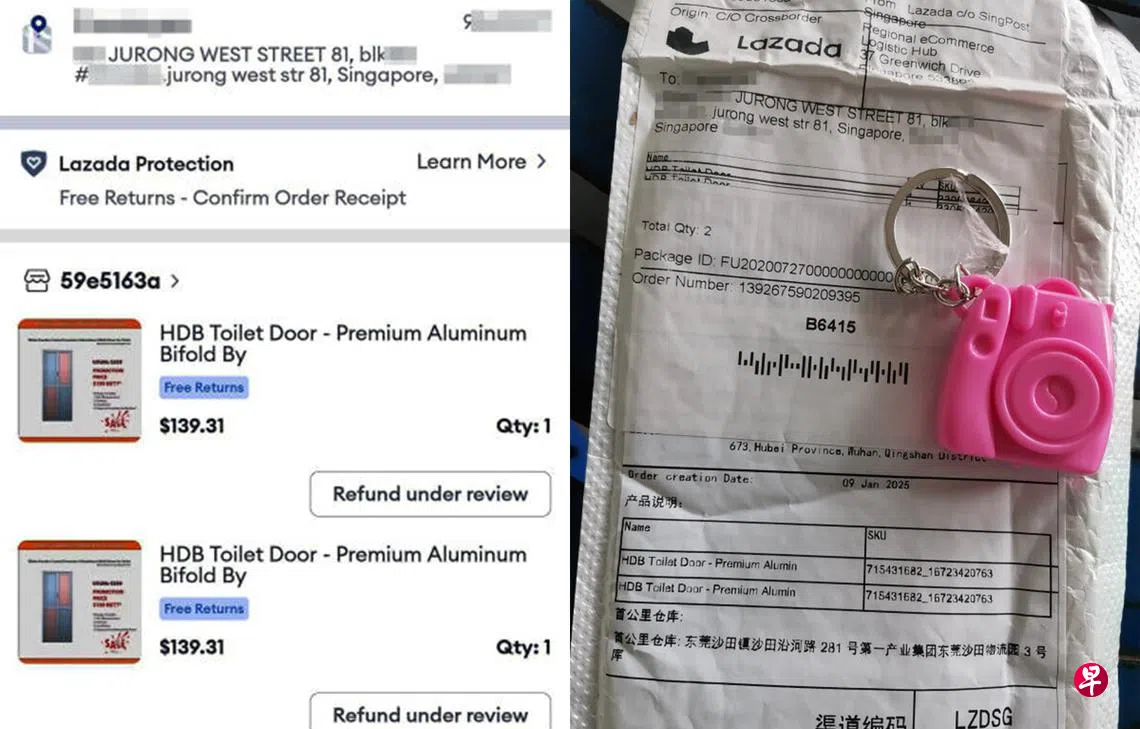 事主颜先生(70岁,船具供应商经理)告诉《新明日报》记者,他本月9日在网购平台Lazada购买了两个厕所折叠门,后来收到的竟然只是一个钥匙扣。