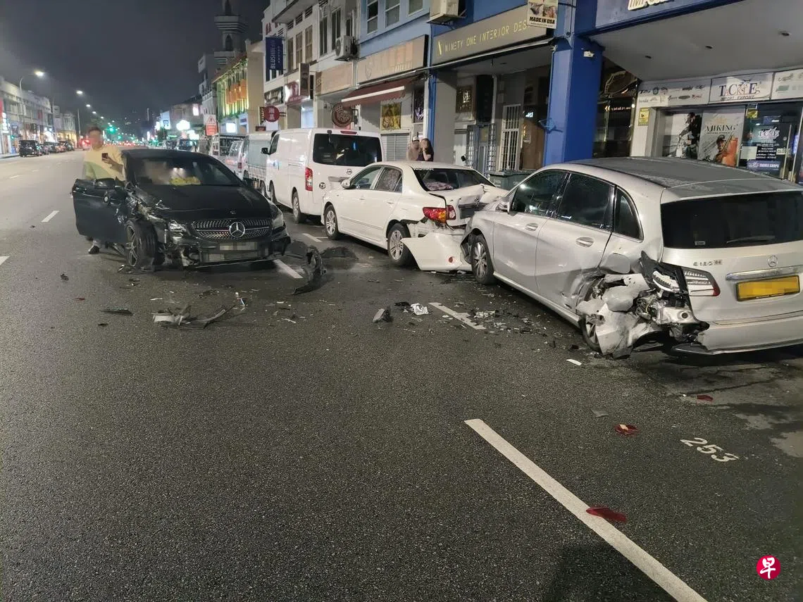 疑酒驾闯祸,一辆马赛地凌晨连撞停在芽笼路边的数辆汽车,37岁男驾驶被捕。