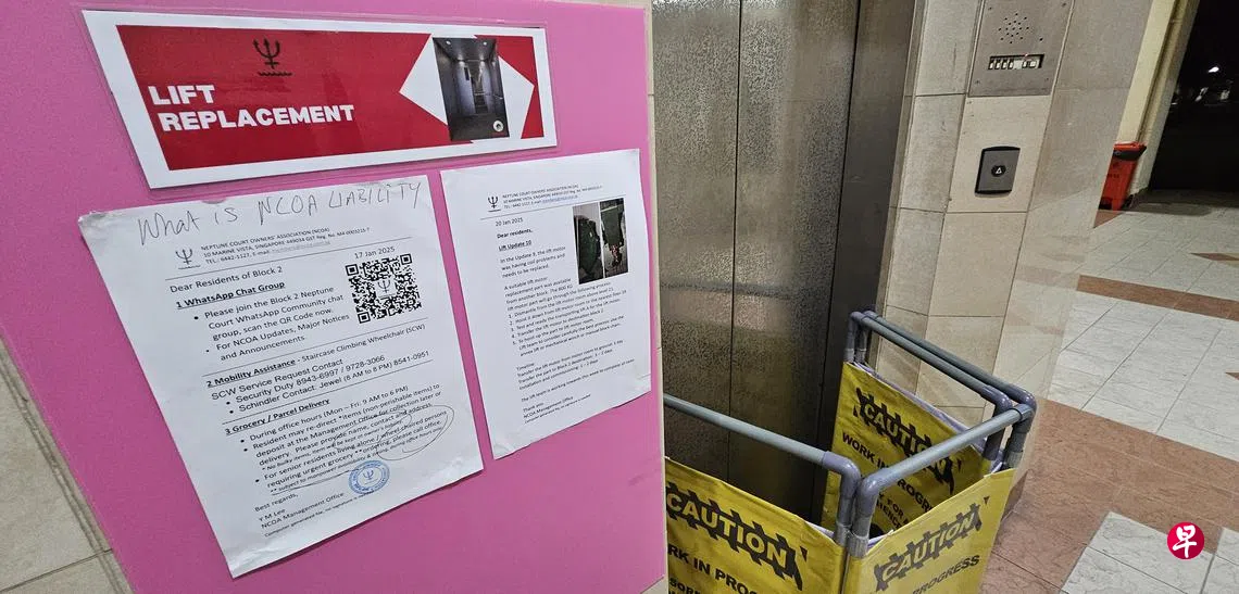 《新明日报》接获消息,指东海岸一带的海皇阁(Neptune Court)公寓的第二座,楼高21层,但两架电梯同时不能用,居民每天必须爬楼梯回家,苦不堪言。