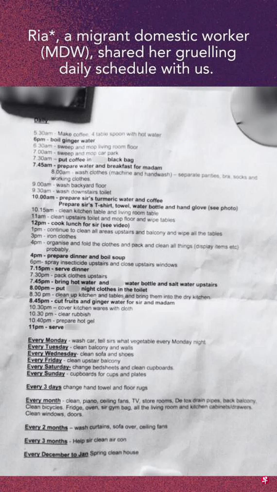 《新明日报》报道,非政府组织“温情之家”(简称HOME)日前在脸书上传一张女佣的“时间表”,指是外籍女佣莉亚(化名)发给该组织的。