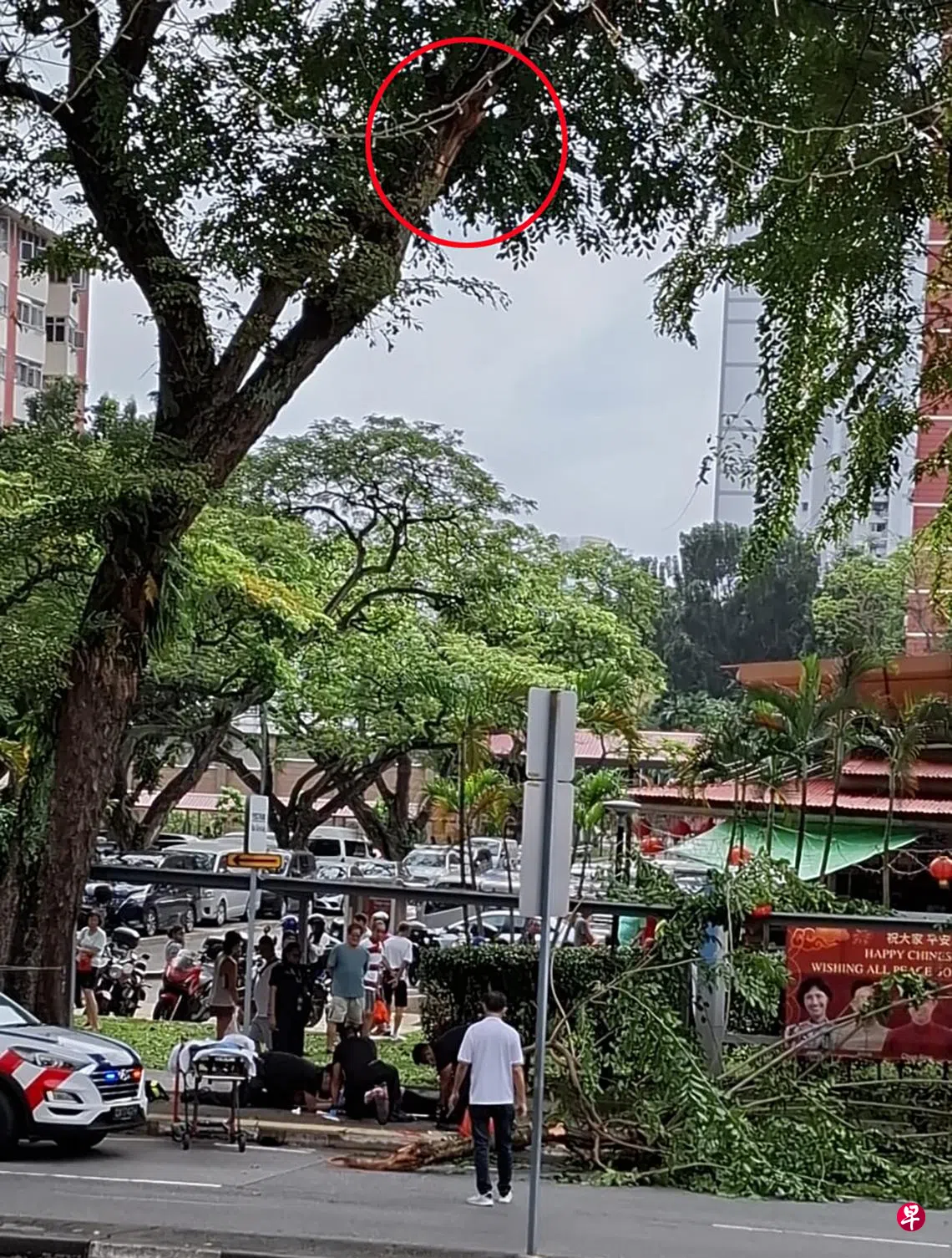 红山巴刹与熟食中心前,直径达16公分的粗大枝干掉落,砸中一名妇女,导致她头破血流,救护人员现场急救后送院。