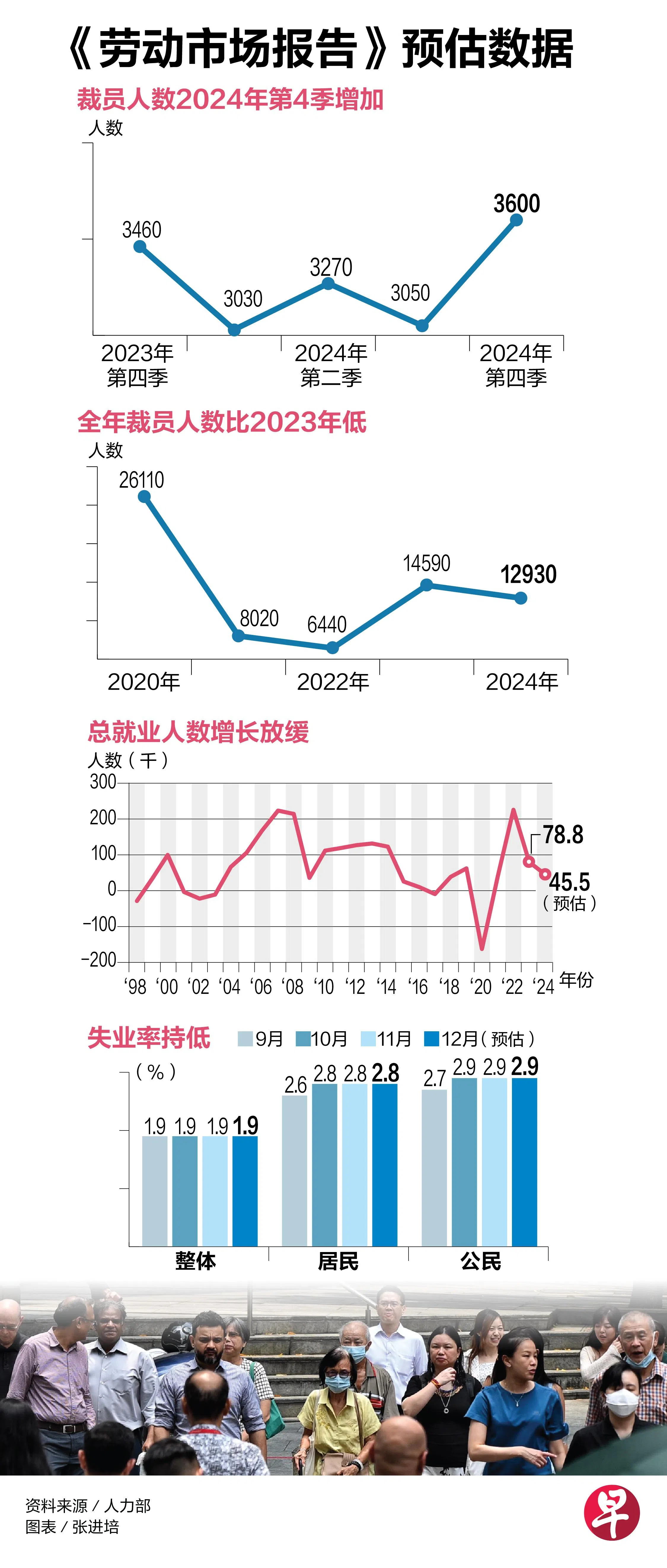 人力部星期一也公布2024年第四季《劳动市场报告》预估数据,反映总就业人数增长放缓。去年全年的裁员人数则减至1万2930人。