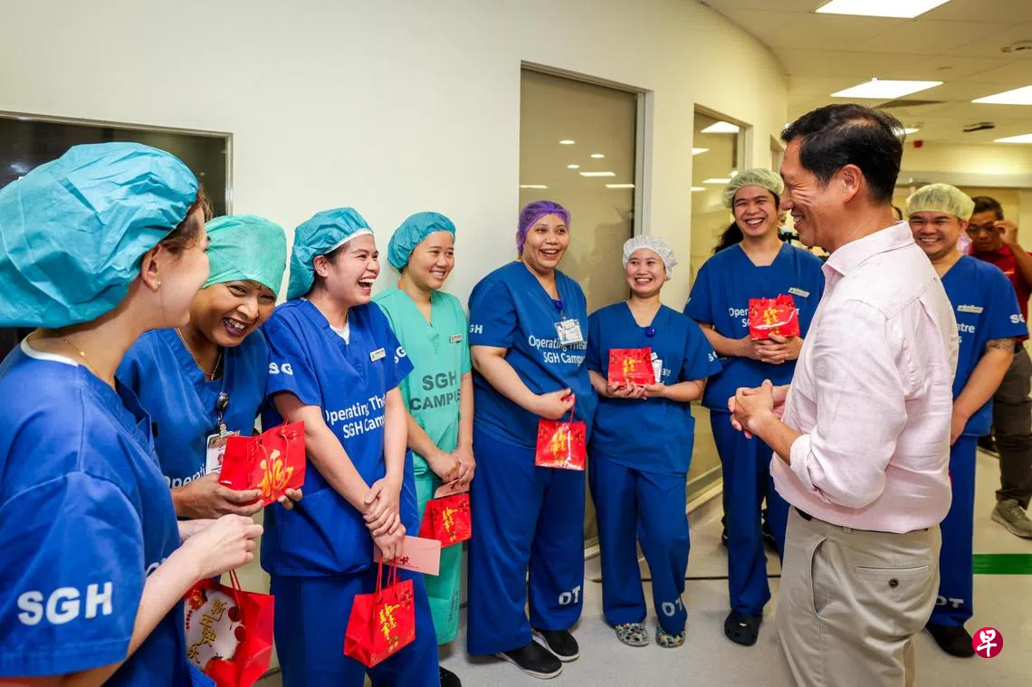 卫生部长王乙康星期三(1月29日)大年初一走访新加坡中央医院和欧南社区医院,探访节日期间仍坚守岗位的医护人员,为他们送上柑橘和祝福。他在活动上接受媒体访问时宣布,卫生部将调高综合医疗保健人员(allied health professionals)、药剂师,以及行政、辅助和支援人员这三组医疗人员的薪资。
