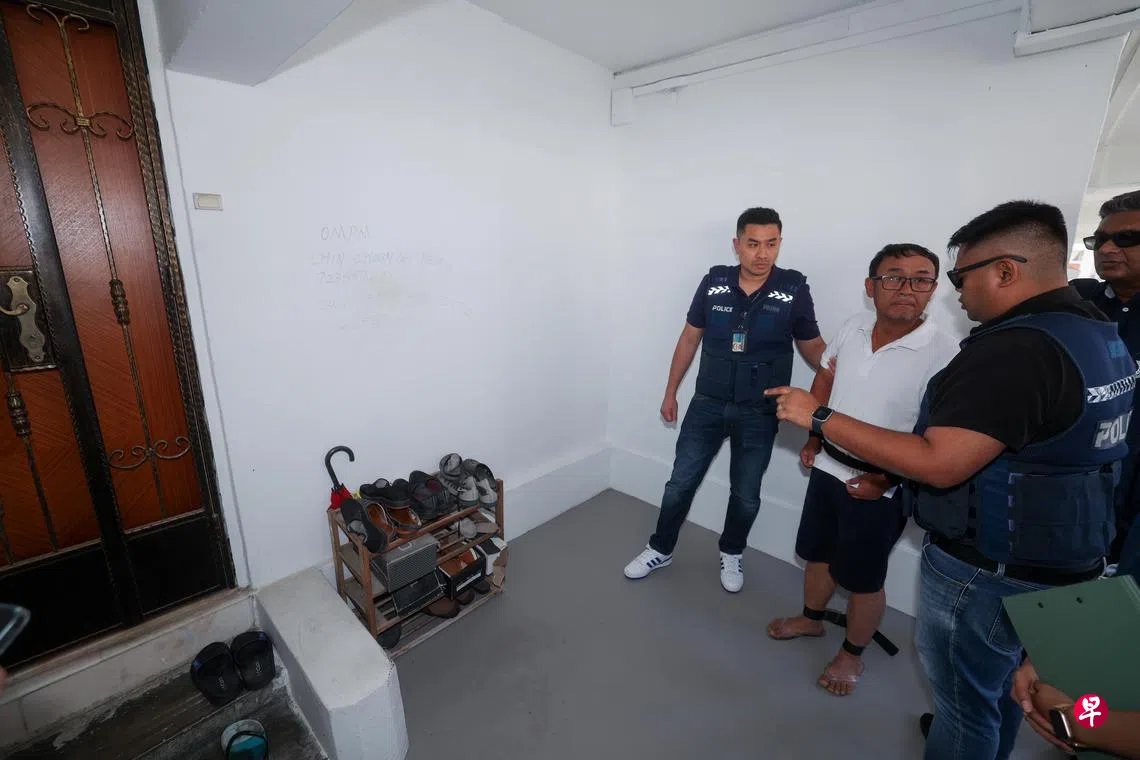 被指协助大耳窿进行骚扰,利用脚踏车锁将组屋单位的铁门锁上,41岁和42岁中国籍男子被押回案发现场协助调查。