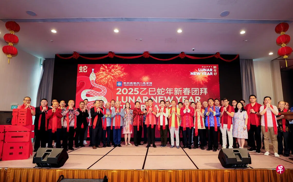 潮州八邑会馆星期六(2月1日)大年初四在醉花林俱乐部举行新春团拜,约350人出席,现场有醒狮贺岁,财神爷送福,在欢腾的“兴、顺、发”拜年声中,把春节气氛拉满。