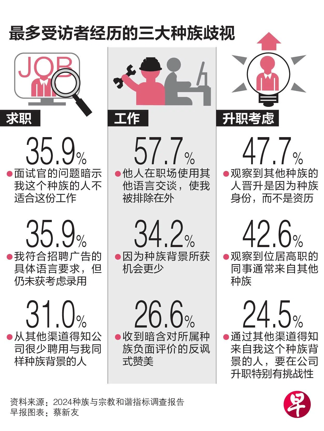 受到职场歧视的人当中,多达57.7%反映他人在工作中使用其他语言交谈,使自己被排除在外;也有34.2%觉得自己的种族背景导致机会更少。