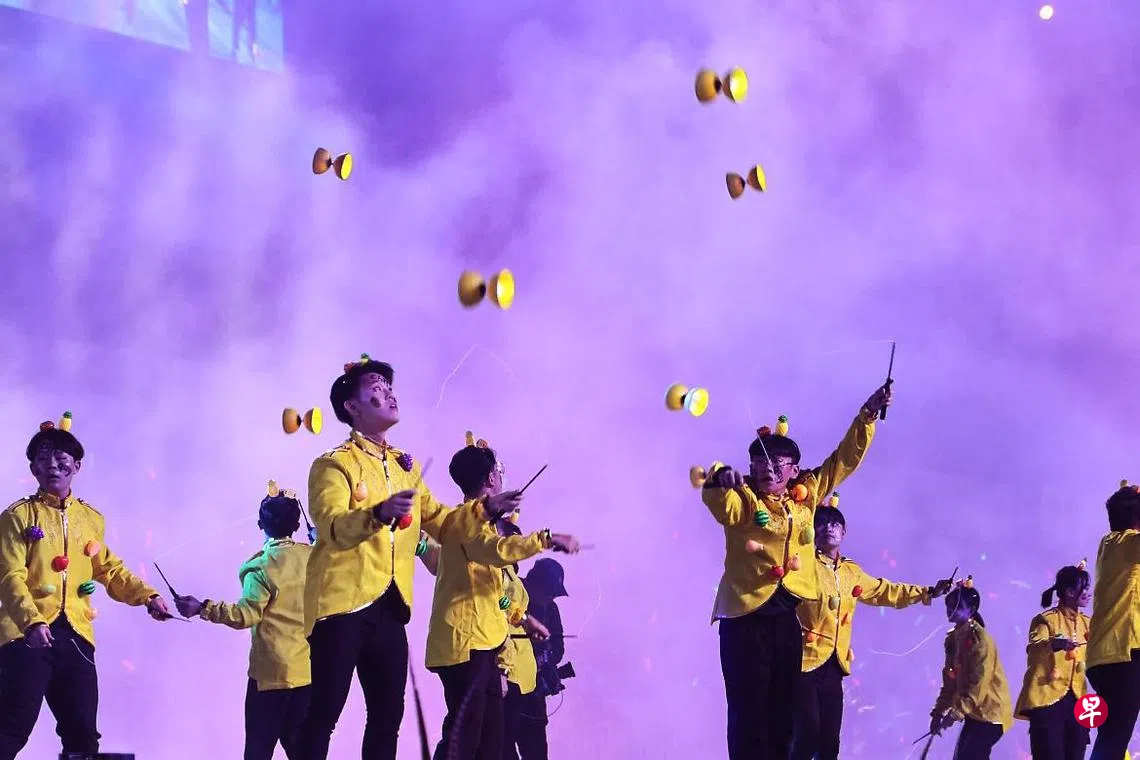 马来西亚表演团来新参与今年的妆艺大游行,为本地观众献上精彩的高杆耍大旗和扯铃表演,也象征新马共同推动非物质文化遗产的保护与传承。